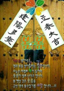 입춘대길 건양다경 (立春大吉 建陽多慶) : 봄으로 들어가니 크게 길하고 경사스러운 일이 많이 생기기를 바란다.
